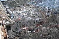 Bild links oben: freigelegter Granitsteinbogen der Barocken Brücke während der Sanierung im Jahr 2008.